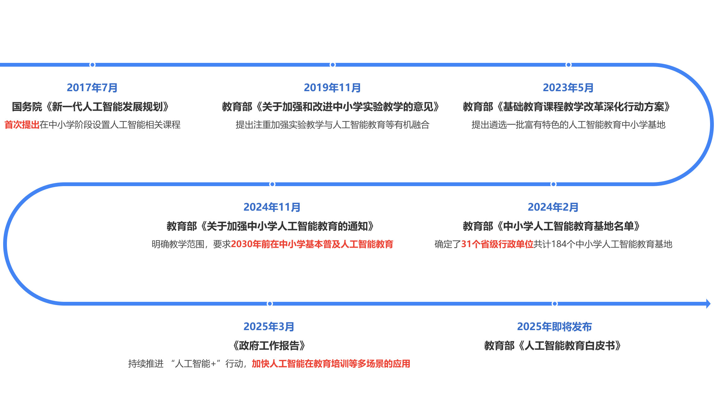 教育部办公厅印发了《关于加强中小学人工智能教育的通知》(教基厅函〔2024〕32号),通知强调了要探索中小学人工智能教育实施途径,加强中小学人工智能教育,2030年前在中小学基本普及AI教育;明确规划了普及范围: